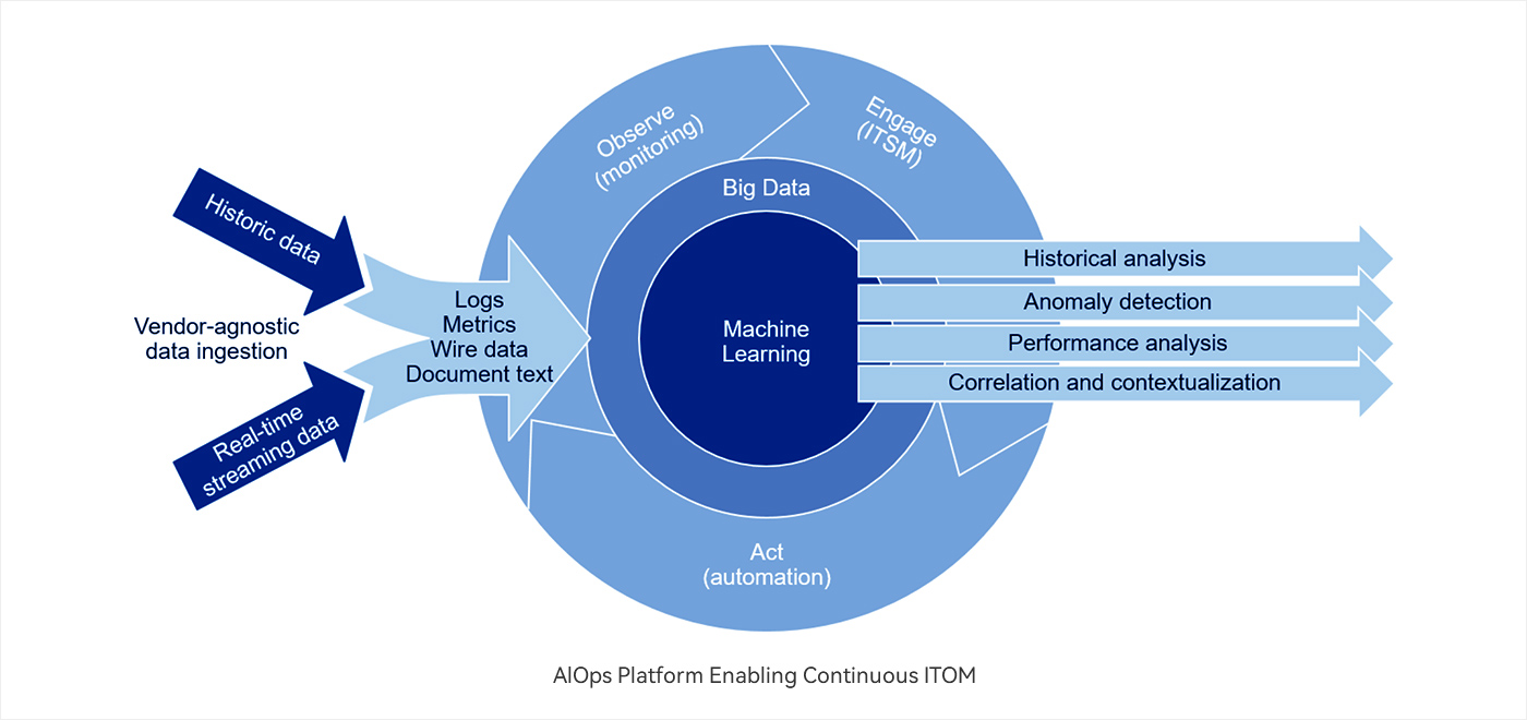 通過(guò)對(duì)數(shù)據(jù)量、種類(lèi)和速度這三個(gè)維度不斷增長(zhǎng)的IT數(shù)據(jù)的升級(jí)攝取和分析,為所有主要的IT運(yùn)行的功能提供支撐。