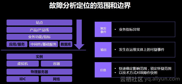 發(fā)現(xiàn)故障后若無(wú)法快速切換恢復(fù)正常運(yùn)行則需要深入分析原因。但是在智能根因推薦中也存在眾多難點(diǎn)。首先,故障分析定位的范圍及邊界難以確定。例如,是否需要定位到bug存在于哪段代碼,發(fā)布的哪個(gè)版本,但這個(gè)定位范圍并不是這里需要的。這里的邊界是阿里自定義后的邊界。確定邊界后,需要通過(guò)日志、監(jiān)控、報(bào)警信息及一些集群圖表來(lái)收集故障定位信息。然后進(jìn)行定位判斷和邏輯決策,判斷哪些是出現(xiàn)該問(wèn)題最可疑的部分并且提出解決策略。在IT行業(yè)的技術(shù)棧架構(gòu)下,阿里的應(yīng)用程序及業(yè)務(wù)是依靠下圖所示的技術(shù)基礎(chǔ)設(shè)施分層搭建出的。