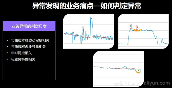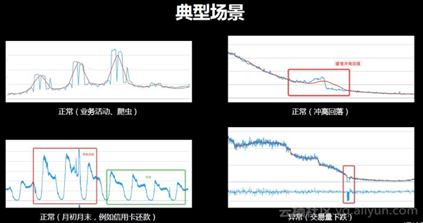 圖一中為爬蟲(chóng)現(xiàn)象,若機(jī)器學(xué)習(xí)到的結(jié)果通常顯示為該現(xiàn)象,那么就認(rèn)為這不是業(yè)務(wù)異常。圖二所示現(xiàn)象是否應(yīng)視為異常如今在阿里內(nèi)部仍沒(méi)有定論,對(duì)此可以設(shè)置一些靈敏度選擇,根據(jù)不同情況設(shè)置為不同結(jié)果。圖三所示的周期性探測(cè)中,大多數(shù)業(yè)務(wù)都以天或者星期為周期,但該業(yè)務(wù)更多的與月初月末相關(guān),例如信用卡還款、話費(fèi)流量充值等,因此這種業(yè)務(wù)是日周期、周周期和月周期的疊加。上文中的算法具備自動(dòng)探測(cè)周期的能力。圖四是最經(jīng)典的探測(cè)到交易量的驟然下跌。由此可見(jiàn),該算法模型可以適配各行業(yè)的業(yè)務(wù)數(shù)據(jù)。對(duì)于底層的系統(tǒng)級(jí)數(shù)據(jù)也有相對(duì)應(yīng)的特定算法。