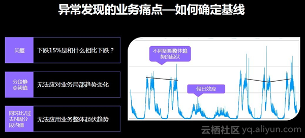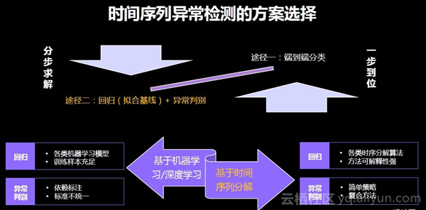 接下來(lái)就借助機(jī)器學(xué)習(xí)來(lái)解決該問(wèn)題。這里可以有兩種途徑供選擇,各有優(yōu)劣。途徑一是通過(guò)端到端分類,不計(jì)算基線直接判斷異常;途徑二通過(guò)回歸擬合基線判斷異常。阿里采用的是途徑二,對(duì)業(yè)務(wù)更可控,擬合出的基線對(duì)能否準(zhǔn)確的判定異常至關(guān)重要。途徑二可以通過(guò)基于時(shí)間序列分解或者機(jī)器學(xué)習(xí)/深度學(xué)習(xí)實(shí)現(xiàn)。阿里業(yè)務(wù)中,通過(guò)基于時(shí)間序列分解來(lái)進(jìn)行擬合回歸,機(jī)器學(xué)習(xí)/深度學(xué)習(xí)來(lái)解決判斷異常。