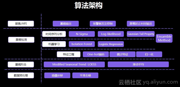 整體算法框架如下圖所示。首先對(duì)數(shù)據(jù)進(jìn)行預(yù)處理,包括差值補(bǔ)缺和平滑去噪。然后基于優(yōu)化后的時(shí)間序列分解Seanonal Trend LOESS方法進(jìn)行基線擬合,滑動(dòng)平均使曲線平滑。然后結(jié)合時(shí)間序列分析、機(jī)器學(xué)習(xí)以及特征工程中的各種方法,判斷一個(gè)時(shí)間片段是否需要報(bào)警。開(kāi)始設(shè)計(jì)時(shí)并未確定該算法應(yīng)采取哪些方法,而是被阿里巴巴各行業(yè)的業(yè)務(wù)、形態(tài)各異的數(shù)據(jù)以及判斷標(biāo)準(zhǔn)訓(xùn)練出來(lái)的。它的優(yōu)勢(shì)在于對(duì)各行業(yè)的數(shù)據(jù)有較高的適配性,對(duì)非技術(shù)性的曲線波動(dòng)有較強(qiáng)的抗干擾能力。此外,該算法會(huì)輸出擬合的基線,并且內(nèi)部系統(tǒng)中可以通過(guò)該基線提前100分鐘預(yù)測(cè)趨勢(shì),當(dāng)然距離越近的預(yù)測(cè)越準(zhǔn)確,預(yù)測(cè)時(shí)會(huì)將歷史波動(dòng)和局部變化趨勢(shì)都考慮在內(nèi),每個(gè)瞬間都會(huì)判斷這個(gè)時(shí)刻是否需要報(bào)警。出現(xiàn)報(bào)警后,可以回溯到該報(bào)警的開(kāi)始時(shí)間和結(jié)束時(shí)間,由此達(dá)到整體的報(bào)警功能。