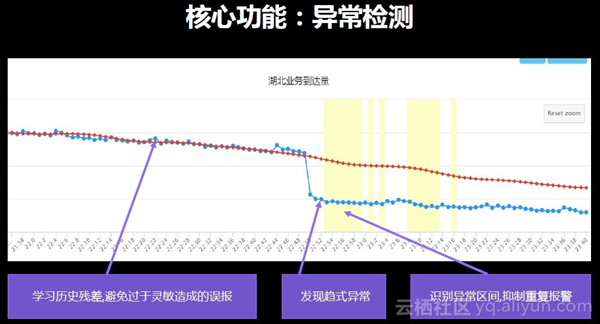上述內(nèi)容給大家介紹了在故障發(fā)現(xiàn)和原因分析中引入機(jī)器學(xué)習(xí)算法和一些工程框架,這也就是AIOps理念實(shí)際落地的產(chǎn)品。阿里希望可以借助阿里云平臺(tái)孵化AIOps智能運(yùn)維解決方案,將這個(gè)企業(yè)產(chǎn)品賦能給客戶,進(jìn)而共同提升企業(yè)穩(wěn)定性。AIOps智能運(yùn)維解決方案的核心功能有三個(gè)。一是異常檢測(cè)。下圖為客戶實(shí)際測(cè)試得出的一個(gè)例子,通過(guò)預(yù)測(cè)來(lái)判斷曲線本應(yīng)趨勢(shì)如何,學(xué)習(xí)歷史殘差,避免過(guò)于靈敏造成誤報(bào),即存在某些毛刺是視為無(wú)異常情況的。一旦發(fā)現(xiàn)明顯的趨勢(shì)偏離,便可以立刻識(shí)別和報(bào)警,并且在持續(xù)偏離的情況下識(shí)別異常區(qū)間抑制重復(fù)報(bào)警。