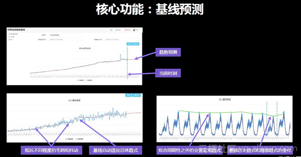第二個(gè)核心功能是基線預(yù)測(cè)??梢酝ㄟ^(guò)回歸擬合預(yù)測(cè)距當(dāng)前時(shí)間100分鐘內(nèi)的趨勢(shì),這對(duì)處理業(yè)務(wù)有極大的幫助。如上文所說(shuō),該算法通過(guò)學(xué)習(xí)和訓(xùn)練各行業(yè)的數(shù)據(jù)得出,因此即使數(shù)據(jù)有較多的毛刺和抖動(dòng),歷史趨勢(shì)完全不同,該框架都能較好的適應(yīng),均方誤差較小。直觀來(lái)說(shuō),擬合出的紅線一定是大家理想的檢測(cè)業(yè)務(wù)下跌的基準(zhǔn),因此為它命名為智能基線。