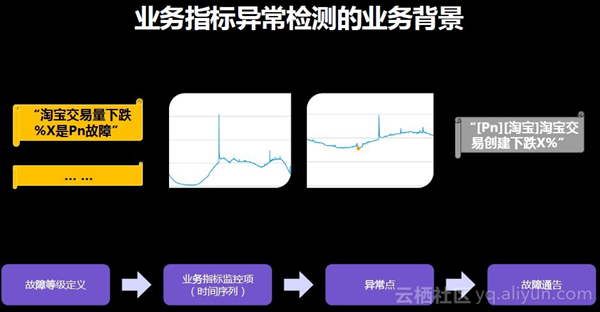 阿里中有成千甚至上萬(wàn)個(gè)核心業(yè)務(wù)指標(biāo),例如淘寶的成交量、菜鳥(niǎo)裹裹的包裹量等。如何定義何時(shí)出現(xiàn)問(wèn)題,這其實(shí)是一個(gè)艱難的行為。因此希望可以將業(yè)務(wù)上的一個(gè)問(wèn)題通過(guò)監(jiān)控轉(zhuǎn)化為一個(gè)技術(shù)問(wèn)題。這里需要澄清的一點(diǎn)是,大家經(jīng)常需要監(jiān)控的一些指標(biāo),例如集群的CPU利用率、網(wǎng)絡(luò)流量或者應(yīng)用程序的response time等,都是系統(tǒng)和應(yīng)用層面的監(jiān)控,不是業(yè)務(wù)層監(jiān)控。有時(shí)系統(tǒng)應(yīng)用出現(xiàn)問(wèn)題時(shí)業(yè)務(wù)有可能并不受其影響,例如高可用集群的異地容災(zāi)切換保證中,局部集群掛掉可能用戶使用并不會(huì)出現(xiàn)問(wèn)題,但另一角度看,可能系統(tǒng)任何問(wèn)題都沒(méi)有出現(xiàn)但是業(yè)務(wù)受到影響,例如運(yùn)營(yíng)商的骨干網(wǎng)出現(xiàn)問(wèn)題,這種情況下仍然需要采取措施來(lái)防止流量下降。因此監(jiān)控的目標(biāo)需要直達(dá)業(yè)務(wù)結(jié)果,業(yè)務(wù)量下跌即為出現(xiàn)故障,雖然故障可能不是由于系統(tǒng)本身引起,但仍需要發(fā)現(xiàn)并定位該故障。如此將一個(gè)對(duì)業(yè)務(wù)的監(jiān)控通過(guò)以下流程進(jìn)行轉(zhuǎn)換,首先對(duì)故障進(jìn)行等級(jí)定義,對(duì)時(shí)間序列的業(yè)務(wù)指標(biāo)監(jiān)控,定位異常點(diǎn),做出故障通告。