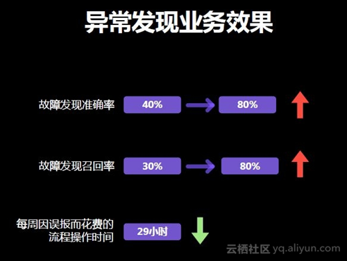 該算法達(dá)到的效果十分明顯,故障發(fā)現(xiàn)準(zhǔn)確率由40%提升至80%,故障發(fā)現(xiàn)召回率從30%提升至80%,每周因誤報(bào)而花費(fèi)的流程操作時(shí)間下降了29小時(shí)。