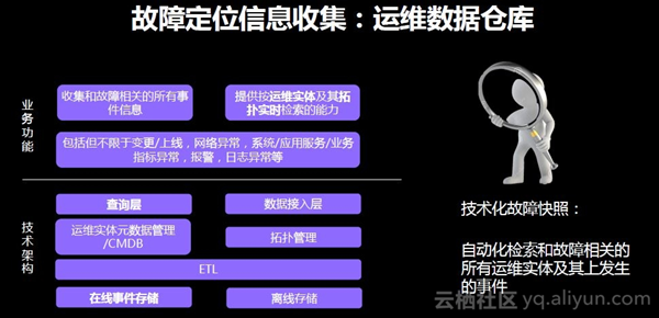 了解故障智能分析流程后,其中仍有一些基礎(chǔ)的細(xì)節(jié)仍需要詳細(xì)介紹,例如運(yùn)維數(shù)據(jù)倉(cāng)庫(kù),數(shù)據(jù)倉(cāng)庫(kù)是指為了解決某一領(lǐng)域的專業(yè)問(wèn)題將一些在線數(shù)據(jù)作匯聚和整理。但為了故障定位而設(shè)置數(shù)據(jù)倉(cāng)庫(kù),并不只是簡(jiǎn)單的將可能影響線上業(yè)務(wù)穩(wěn)定性的所有數(shù)據(jù)匯聚。這里的數(shù)據(jù)倉(cāng)庫(kù)是希望實(shí)現(xiàn)自動(dòng)檢索與故障相關(guān)的事件。因此,運(yùn)維數(shù)據(jù)倉(cāng)庫(kù)不僅需要匯聚這些數(shù)據(jù),也需要耦合對(duì)這些數(shù)據(jù)的組織關(guān)系,即metadata元數(shù)據(jù),運(yùn)維中特指CMDB(Configuration Management Database)。相信大家會(huì)使用文字的形式記錄每次的故障報(bào)告,但這些文字不可編程也不可檢索,那么運(yùn)維數(shù)據(jù)倉(cāng)庫(kù)便可以幫助大家實(shí)現(xiàn)技術(shù)化的、結(jié)構(gòu)化的故障快照。